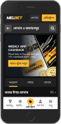 - উইকলি অ্যাপ ক্যাশব্যাক: আপনি যদি ওয়েবসাইটের পরিবর্তে Melbet এর মোবাইল অ্যাপটি ব্যবহার করেন তবে প্রতি সপ্তাহে জিতে নিতে পারেন ১০% ক্যাশব্যাক। এর জন্য আপনাকে কমপক্ষে ৩৭৪ টাকা বেট করতে হবে।